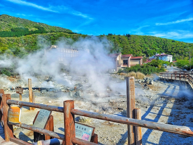白く煙る「地獄」と呼ばれる噴気地帯が独特の景観を形成し、江戸時代から湯治場として栄えてきた歴史が今も息づいている。